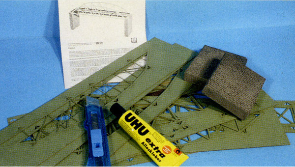 Pro práci budete potřebovat pouze modelářský nůž. Kromě přiloženého lepidla můžete pracovat i s lepidlem UHU – Alleskleber.