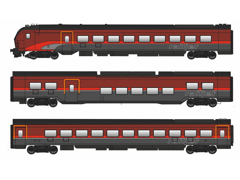 3dílná jednotka Railjet II – Garnitur, skládající se z řídícího, dvou vložených vozů 2.třídy a koncového vozu. Minimální poloměr 419 mm.