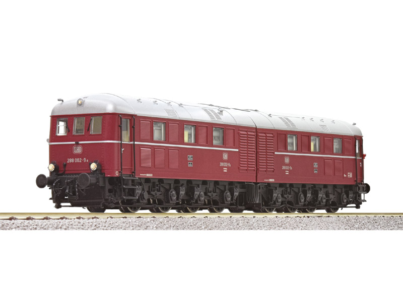 Dieselelektrická dvojitá lokomotiva 288 002 Deutsche Bundesbahn. Kompletní redesign! V letech 1941 a 1942 byly do výzbroje německého Wehrmachtu zařazeny celkem čtyři dvojité lokomotivy typu D 311. Byly postaveny pro přepravu těžkých železničních děl. Dvě lokomotivy, provozní čísla V 188 001 a/b a V 188 002 a/b, byly i po válce používány u Deutsche Bundesbahn. Třetí lokomotiva sloužila jako dárce náhradních dílů. Osvědčily se v těžké nákladní vlakové a tlačné službě, hlavně na rampě Spessart. Lokomotiva číslo V 188 001 musela být odstavena v roce 1968 po poškození generátoru. V 188 002, později 288 002, byla v provozu ve francké oblasti až do roku 1972. V roce 1973 byly oba stroje sešrotovány. Model: Dvojitá lokomotiva složená ze dvou trvale spřažených jednotek; obě jednotky plně vybavené motorem. Kompletní rekonstrukce přechodové oblasti mezi dvěma jednotkami. Věrně reprodukovaná strojovna. Jemně detailní model s mnoha samostatně připojenými díly. Střechy s přídavnými větracími mřížkami v obloucích střechy. Rámové panely každý se 4 pískovači a replikou INDUSI. Směrově závislé trojité světlomety a dvě červená koncová světla. Prolamované střešní průduchy. Instalováno osvětlení kabiny strojvedoucího, pultu strojvedoucího a spínací skříňky, jakož i osvětlení strojovny; přepínatelné v digitálním režimu. Osvětlení LED závislé na směru jízdy. Minimální poloměr oblouku 358 mm. Kinematika krátkého spřáhla s kulisou dle NEM. Není vhodné pro děti do 14 let.
