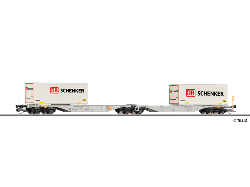 Vůz naložený dvěma kontejnery DB Schenker. Kinematika krátkého spřáhla s šachtou dle NEM. Nevhodné pro děti do 14 let.
