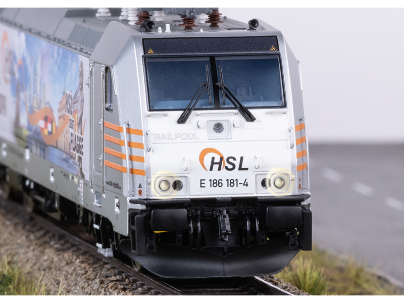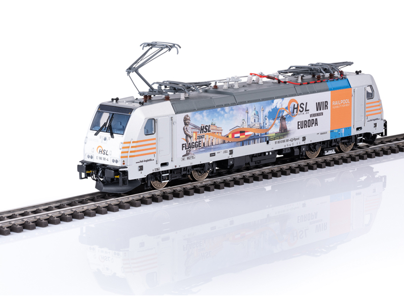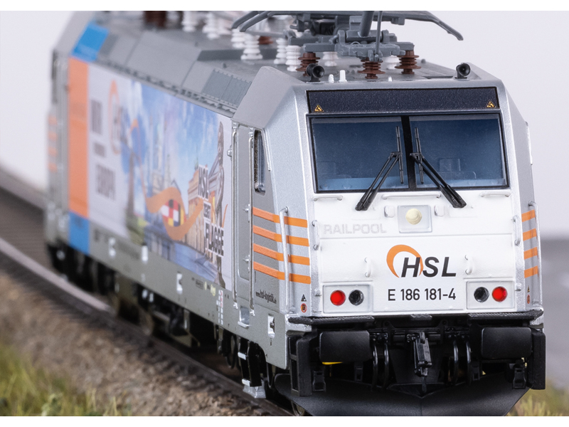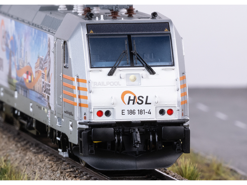 Předloha: Elektrická lokomotiva řady 186 společnosti Railpool GmbH, pronajatá společnosti HSL. Proovzní číslo 186 181-4. Provozní stav od roku 2018 s atraktivním reklamním designem HSL – Spojujeme Evropu. Model: S digitálním dekodérem a rozsáhlými zvukovými funkcemi. Regulovaný vysoce výkonný pohon se setrvačníkem, centrálně instalovaný. Všechny čtyři nápravy jsou poháněny přes kardan. Bandáže. Třísvětelné světlomety a dvě červená koncová světla se mění v závislosti na směru jízdy, v klasickém provozu, digitálně přepínatelné. Dálková světla lze separátně spínat. Světlomety na straně lokomotivy 2 a 1 lze samostatně digitálně vypnout. Funkce dvojitého světla A. Osvětlení kabiny a pultu strojvedoucího lze samostatně digitálně spínat. Osvětlení bezúdržbovými teplými bílými a červenými světelnými diodami (LED). Energetický zásobník energie pro plynulou jízdu. Mnoho samostatně připojených dílů, jako jsou madla, pískovače, zásuvky UIC a střešní vedení. Detailní střešní konstrukce se čtyřmi nově navrženými pantografy s různými kontaktními lištami pro použití v Německu, Belgii, Nizozemsku a Rakousku. Výška nárazníků podle NEM. Brzdová vedení, šroubovky, zásuvky el. kabelů a uzavřené pluhy jsou přiloženy jako samostatně připojitelné díly. Kinematika krátkého spřáhla s šachtou de NEM. Není určeno pro děti do 15 let.