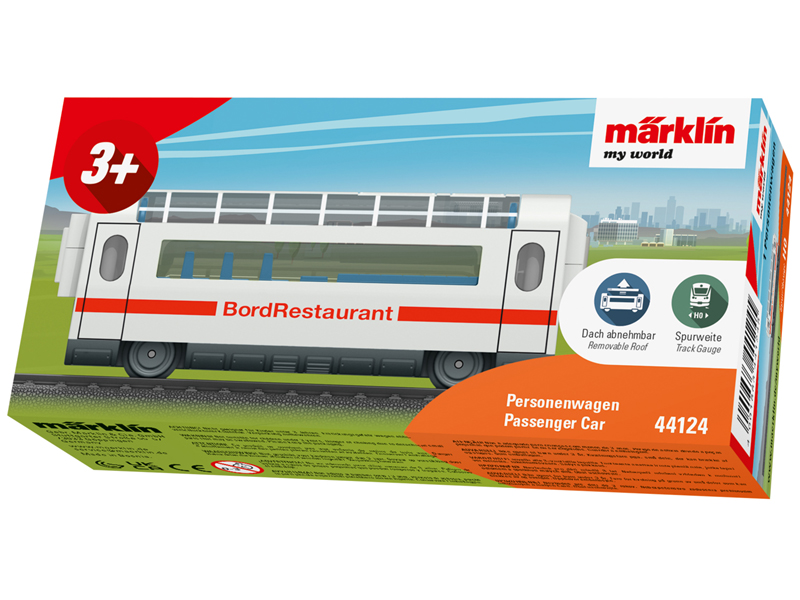 Jídelní vůz Bord Restaurant s odnímatelnou střechou. Magnetické spojky. Vůz je ideálním doplňkem ke startovací sadě 29430 ICE 3. Ostatní vozy jsou k dispozici pod čísly položek 44123 a 44115. Vhodné pro děti od 3 let.