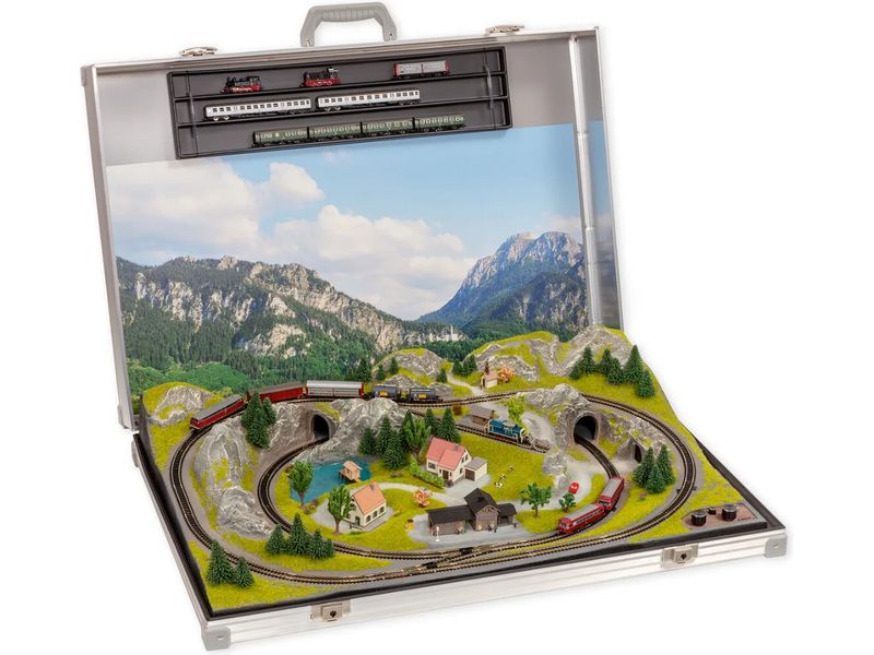 Ani na cestách nemusíte opustit svého koníčka díky tomuto kolejišti v kufru v rozměru N. Krajina je inspirována alpskou oblastí Allgäu. Nejvýraznějšími prvky jsou nádherně zasněžené laserem vyřezávané budovy a také osvětlený vánoční strom, který vytváří slavnostní náladu. Půdorys kolejí umožňuje provoz dvou vlaků, které jsou ovládány nezávisle na sobě. Malá vlečka umožňuje posunovací provoz. Přepínač aktivuje osvětlení na plánku. Vnější rozměry kufru: 79,5 x 54,5cm, výška 16cm. Terén ze strukturální tvrzené pěny, kompletně vyzdobený a vybavený vysoce kvalitními budovami NOCH Laser-Cut. Tři osvětlené budovy (stanice a přístavba osvětlené 2 LED diodami) a navíc osvětlený vánoční stromek. Možnost připojení externího napájecího zdroje (součást dodávky). Modelová železnice je dodávána bez lokomotivy a vagonů! Nevhodné pro děti do 15 let.