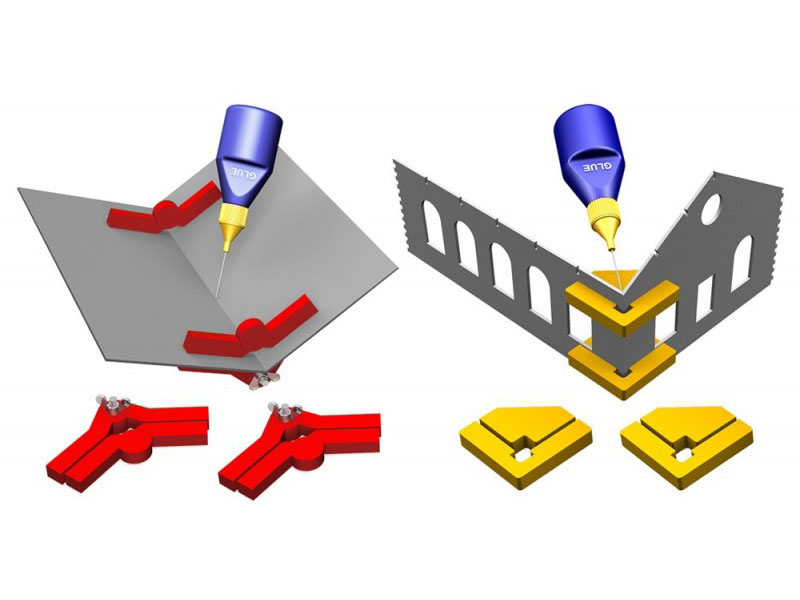 Sada magnetických úhelníků je výborný pomocník při stavbě budov a jiných modelů z desek, slepených v určitém úhlu. Úhelník se jednoduše rozeberte, nastaví se příslušný úhel, jeho díly se umístí dovnitř a vně lepených dílů a zaklapnou. Po vytvrzení lepidla se díly úhelníku Snap & Glue jednoduše odstraní.
