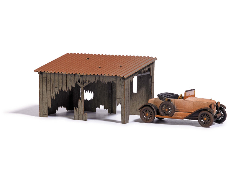 Malý polorozpadlý přístřešek jako přístavba budovy se zrezivělým starým automobilem. Dřevěná konstrukce a zybtky prken ručně kolorovány. Budova je dodávána jako stavebnice, auto jako hotový model. Velikost 67 x 38 mm, výška 35 mm.