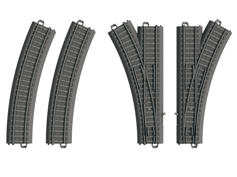 Obsah: 1 levá výhybka, 1 pravá výhybka a 2 obloukové koleje, vyrobené ze stabilního plastu vhodného pro děti. Nevhodné pro děti do 3 let.