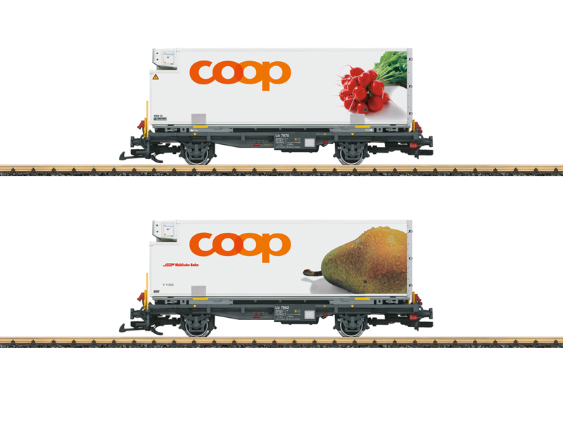 Set kontejnerových vozů s reklamou řetězce Coop s motivem ředkviček a hrušky. Nevhodné pro děti do 15 let.