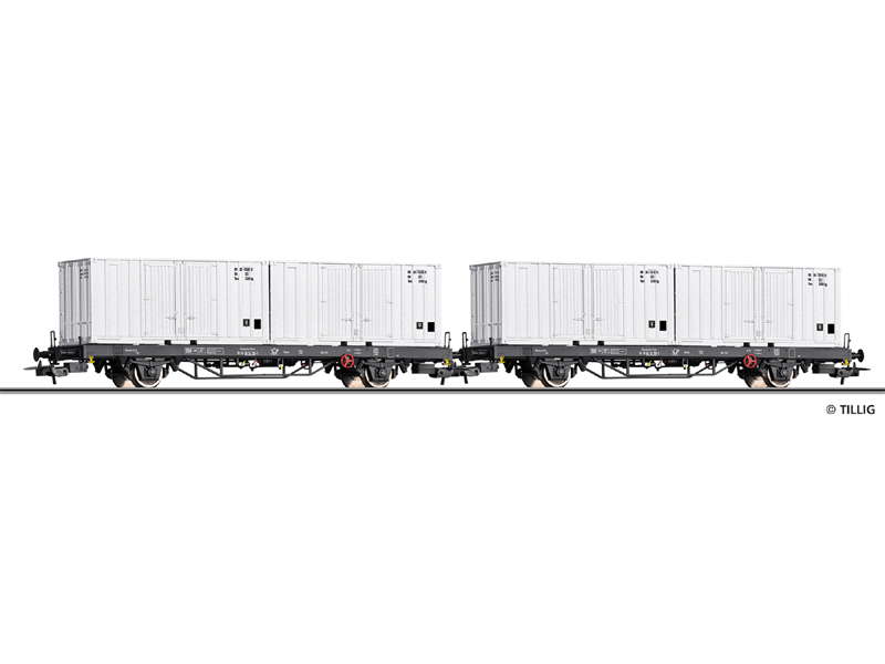 Set obsahuje dva kontejnerové vozy aat/12,8 a čtyři kontejnery 20Ft. Kinematika krátkého spřáhla s šachtou dle NEM. Nevhodné pro děti do 14 let.