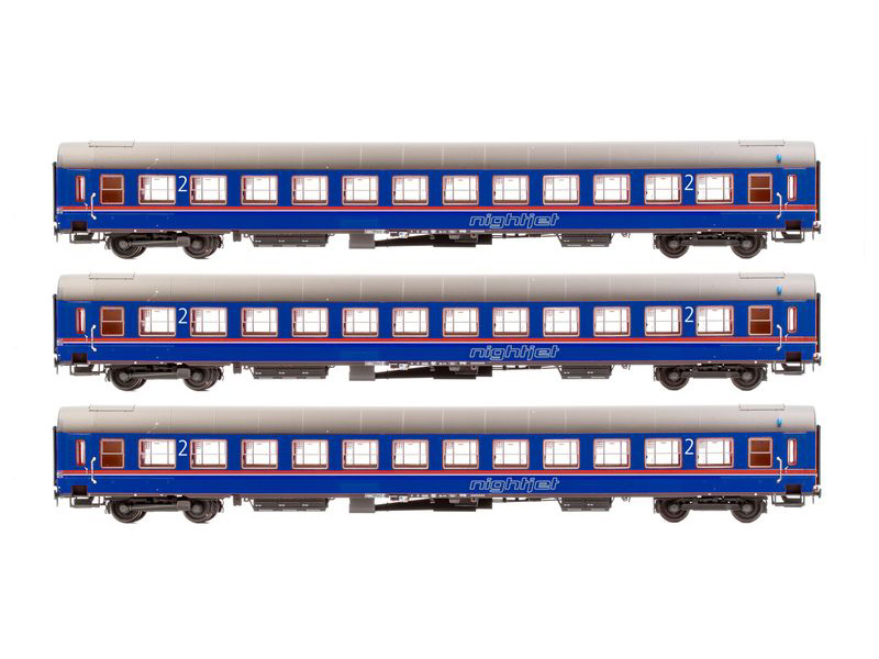 Set obsahuje 3 lůžkové vozy UIC-X v Nightjet designu. 1x 1/2.třída, 2x 2.třída. Minimální poloměr 225 mm.