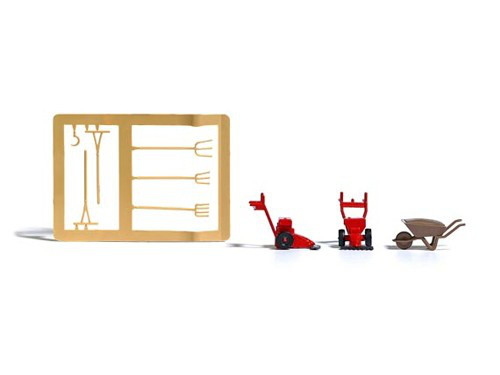 Set obsahuje 2 sekačky, kolečko, hrábě, vidle a srp.