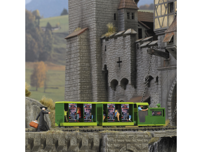 Dieselová lokomotiva Feldbahn a 2 osobní vozy. Sada obsahuje kromě vlaku i kolejový ovál. Není vhodné pro děti do 14 let.