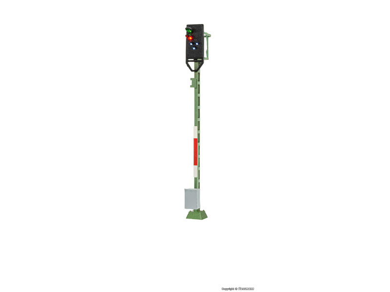 Světelné návěstidlo DB se 3 hlavními a 3 doplňkovými světly. Mosazný stožár vyroben pomocí technologie fotoleptání. Pro všechny analogové a digitální systémy. Bezúdržbové LED osvětlení. Snadná montáž. Výška: 8,0 cm. Nevhodné pro děti do 15 let.